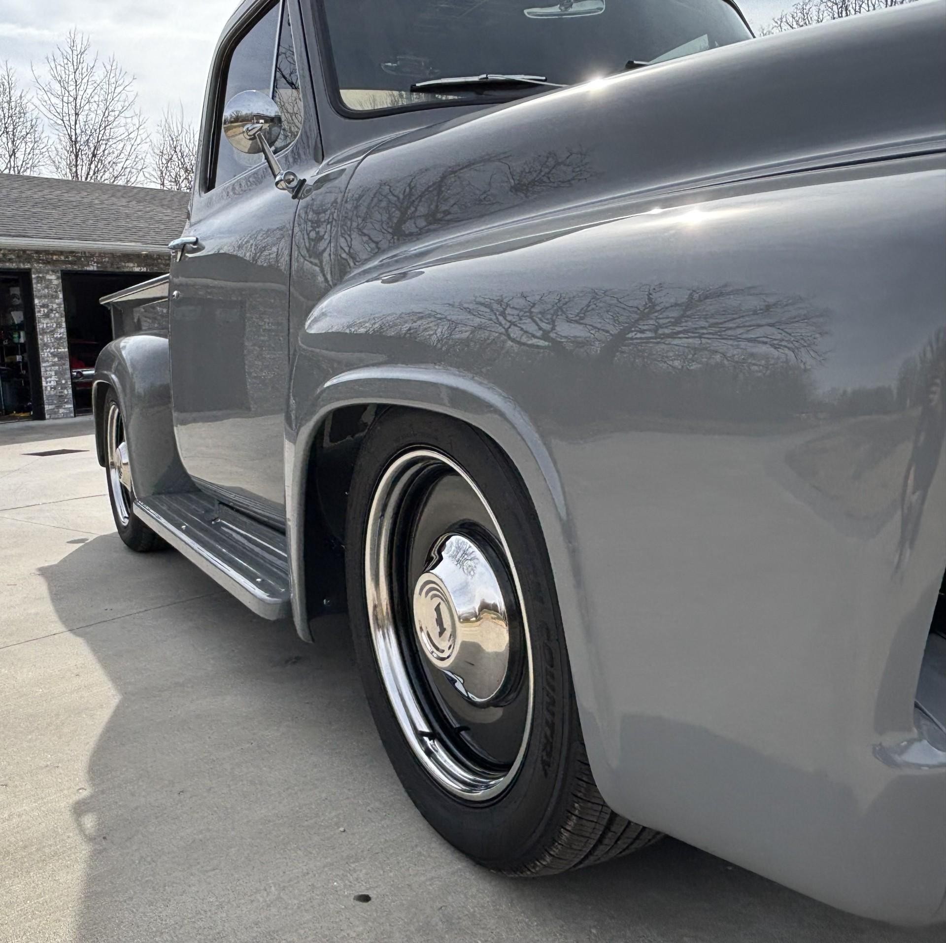 1955 FORD F-100 PICKUP, MUSTANG II FRONT END, 4 LINK REAR END, NEW DISC BRAKES AND LINES, PAINTED FRAME, FRESH 306 ENGINBS FOR WIDER BACK TIRESE WITH A FRESH C-4 TRANSMISSIONCUSTOM WIRING HARNESS, QUICK CONNECT20 INCH DETROIT STEEL WHEELSNEW TIRESNEW BED WITH WHEEL TUBS FOR WIDER BACK TIRESDISTRESSED BED WOOD PAINTED TO MATCH TRUCKBEAUTIFUL CUSTOM INTERIORNICE STEREO SYSTEM WITH BLUETOOTHVINTAGE WHEELVINTAGE HEAT AND AIRNEW DIGITAL GAUGE CLUSTER